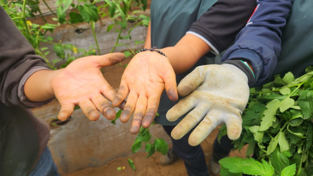 The curriculum covers lessons on using organic and biological pesticides, such as neem oil, to protect crops. Students also learn about beneficial fungi, such as mycorrhizae, which enhance soil health and help plants absorb water and nutrients. Additionally, they explore the five stages of crop growth—planting, development, formation of branches and leaves, flowering and fruiting, and finally, harvest.