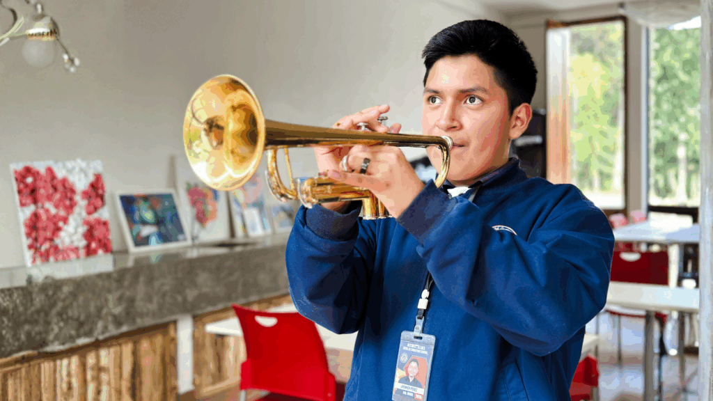 Jhenner (Yeh-nehrr), a spirited ninth-grader at Nicolás Christian School, brings the vibrant sounds of his trumpet to life as one of only three trumpeters in the school’s orchestra. With each powerful note, he adds energy and depth to the ensemble, yet he dreams of welcoming more trumpeters to stand beside him. “We really need more trumpets,” he says with a hopeful smile.